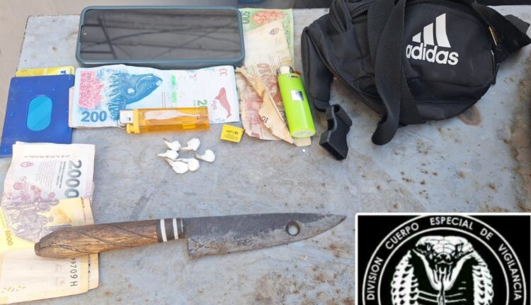 Durante la requisa, los uniformados encontraron en su mochila seis envoltorios de nailon con una sustancia blanca en polvo y un cuchillo de acero con mango de madera de unos 25 centímetros.