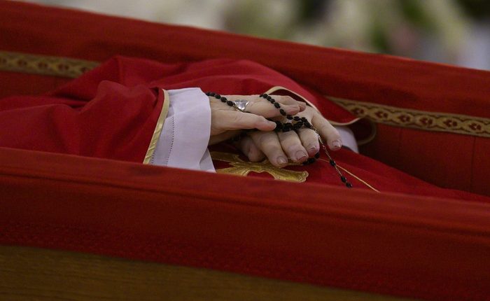 El cuerpo del Papa fue depositado en un único ataúd de madera con el interior de zinc y se expondrá directamente en el féretro abierto, pero no en un catafalco como había sido hasta ahora y tampoco se colocará el báculo papal durante esta exposición.