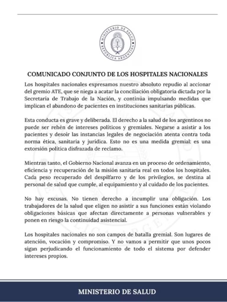 En un clima de tensión que sigue en aumento, el Ministerio de Salud manifestó un fuerte rechazo al paro impulsado por la Asociación de Trabajadores del Estado (ATE), el cual comenzará a partir de la medianoche. La medida de fuerza fue calificada por la cartera sanitaria como una acción que transforma a los hospitales nacionales en “campos de batalla gremial”.
