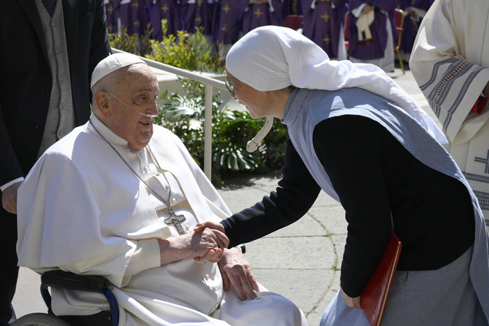 En algunos videos difundidos se ve al Papa saludando a varias monjas junto al altar donde se celebró la misa en la plaza de San Pedro. Pero curiosamente, pese a lo que habían dicho los médicos que lo trataron en el Gemelli de no acercarse a otras personas, las monjas se acercaron al Papa, le dieron la mano, y algunas hasta le besaron la mano.