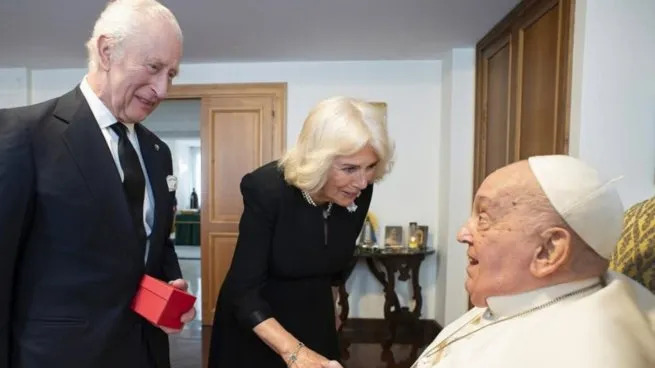 En la foto se ve a Francisco sentado en un sillón estrechando la mano de la reina Camila, a la par de observar al rey Carlos III, quien sostiene un obsequio y permanece de pie.