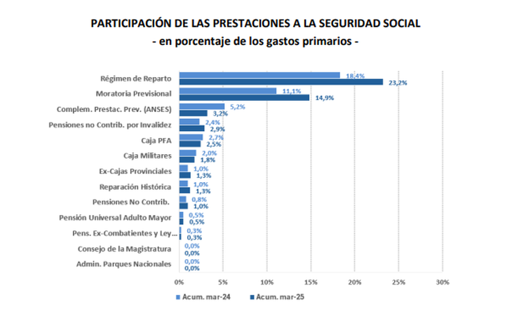 El informe privado destaca que en marzo el gasto del sistema de reparto representó 23,2% del total del gasto primario, mientras que la moratoria previsional explica el 14,9%. Por otro lado, el bono de $70.000 explica el 3,2% del gasto primario, lo que implica una baja de 2 puntos respecto de igual mes del año pasado.