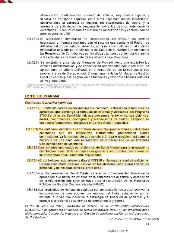 El documento de la SIGEN destacó que: “La Subgerencia de Salud Mental carece de procedimientos formalmente aprobados que unifiquen criterios en lo concerniente al control y aprobación de la información que sirve de base para la facturación de los Hospitales Públicos de Gestión Descentralizada y que: “La modalidad de retribución capitada con umbrales tiende a desincentivar la incorporación de prestaciones por encima del límite establecido por el Instituto, a la vez que incentiva la estrategia de selección de pacientes y el manejo discrecional de su tiempo de permanencia y egreso”-