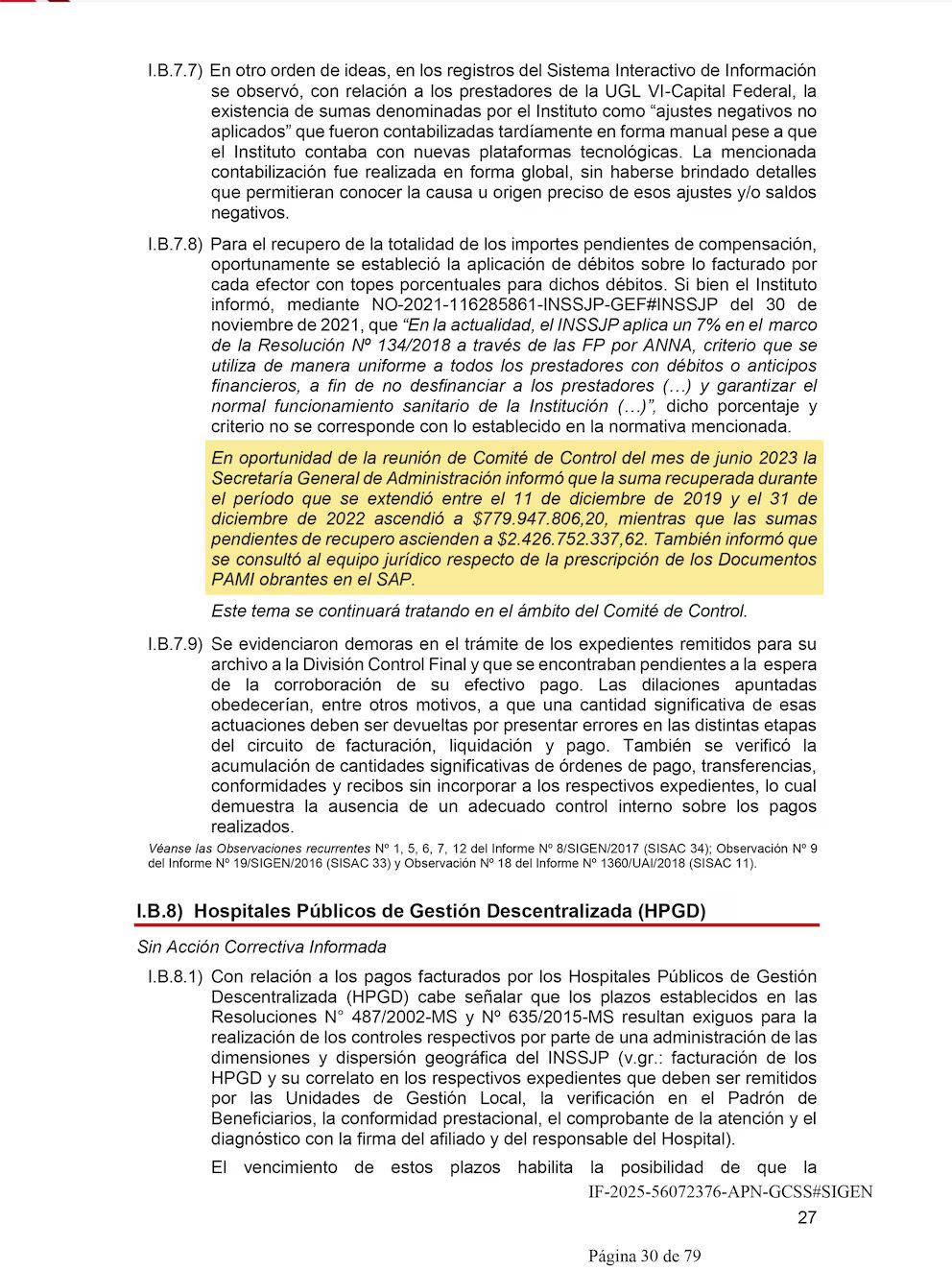 Un punto central del informe de la auditoría de la SIGEN a la que accedió este medio e identificada como IF-2025-56072376-APN-GCSS#SIGEN, hace hincapié a los débitos por servicios no cumplidos o mal prestados, que no son recuperados en tiempo y forma. “Entre diciembre de 2019 y diciembre de 2022, el Instituto solo logró recuperar $779.947.806,20, mientras que los montos pendientes de recupero ascienden a $2.426.752.337,62″, destacó el informe.