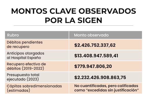 • Entre los hallazgos más críticos del informe figura el caso del Hospital Español. Los auditores señalaron que los fondosderivados, $13.400 millones, fueron otorgados sin garantías y que superan el monto de prestaciones efectivamente brindadas y que los reconocimientos judiciales obtenidos son mínimos respecto a lo reclamado.