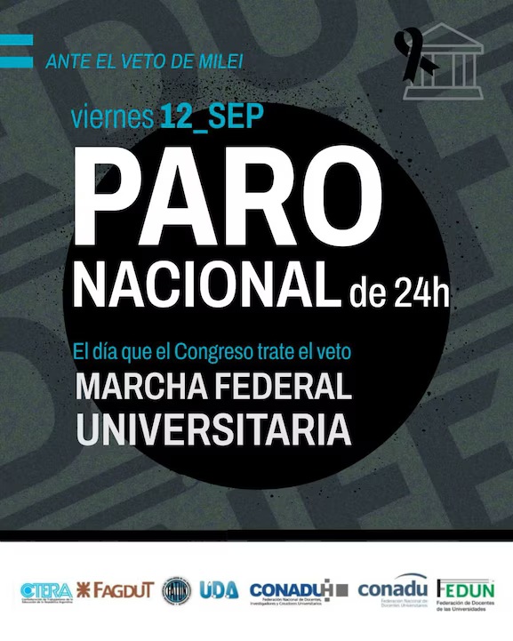 La medida de fuerza de 24 horas fue convocada por la Federación de las Universidades Nacionales (FEDUN), CTERA, FAGUDT, CONADU, CONADU histórica, FATUN y UDA, en rechazo de la iniciativa que lleva la firma del mandatario y se conoció este miércoles. En ese sentido, la oposición estudia convocar a una sesión especial el próximo miércoles para derribar el proyecto.