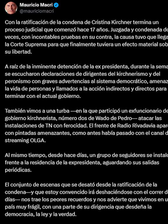 Para Macri, la condena a la exmandataria representa el final de una trama que, según él, estuvo marcada por “zancadillas y trucos” utilizados por Cristina Kirchner para demorar el avance del juicio. “Juzgada y condenada dos veces, con incontables pruebas en su contra, la causa tuvo que llegar a la Corte Suprema para que finalmente tuviera un efecto material sobre su libertad”, marcó.
