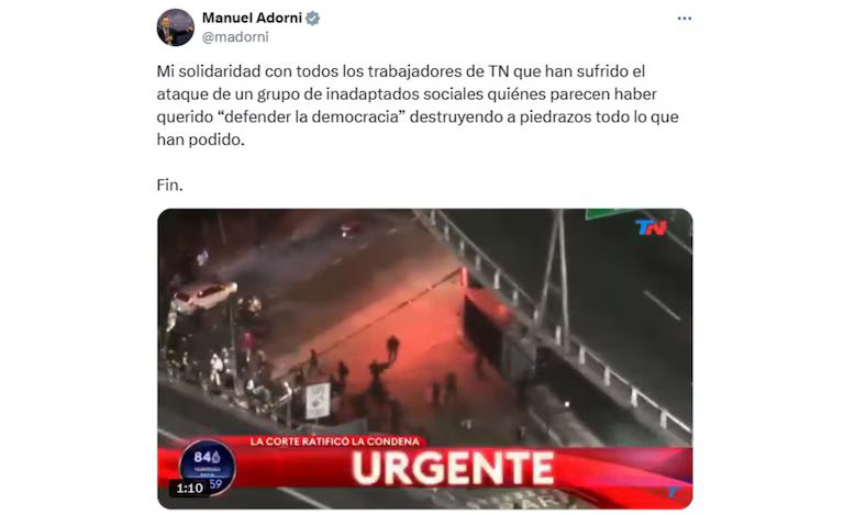 “Mi solidaridad con todos los trabajadores de TN que han sufrido el ataque de un grupo de inadaptados sociales quiénes parecen haber querido “defender la democracia” destruyendo a piedrazos todo lo que han podido. Fin», escribió Adorni.
