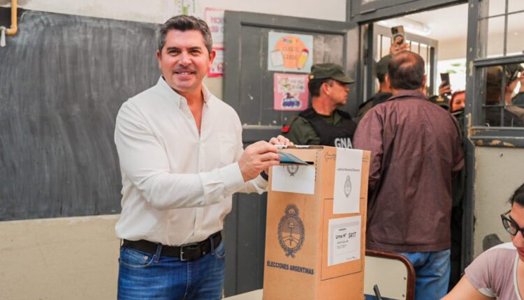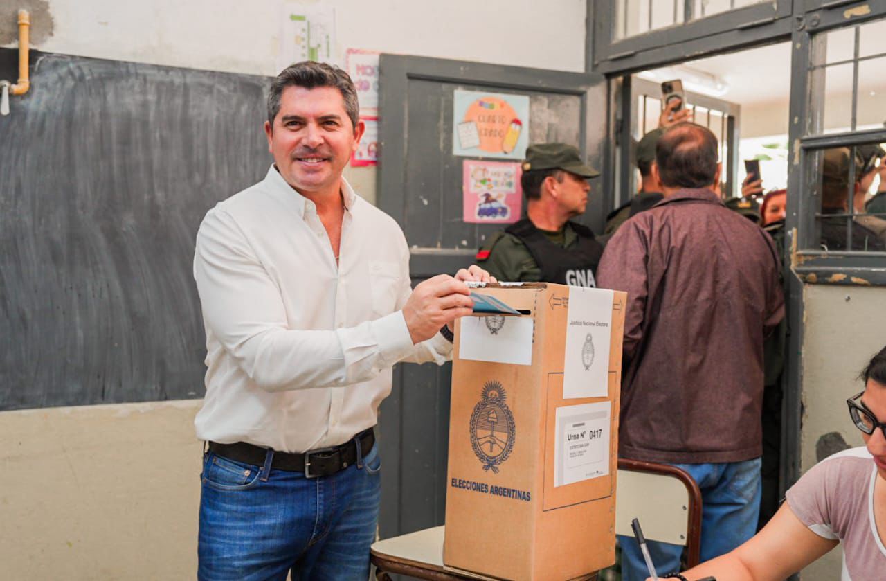 El gobernador Marcelo Orrego emitió su voto en la Escuela Valle del Tulum, en Santa Lucía, acompañado por su hijo y los candidatos de Por San Juan, Fabián Martín y Laura Palma. Orrego destacó el valor democrático del sufragio: