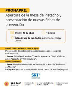El próximo martes 28 de abril a las 10.30 horas, en la Sala Cruce de los Andes, se llevará a cabo la apertura de la Mesa ProNaPre de Pistacho y la presentación de nuevas fichas de prevención, en el marco del fortalecimiento de políticas de seguridad laboral en la provincia.