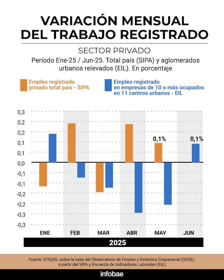 De la misma forma, añade el informe, el nivel de empleo privado registrado del total de los aglomerados urbanos relevados (en empresas de más de 10 personas ocupadas) presenta en junio de 2025 un crecimiento del 0,1%.