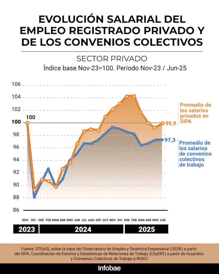 El informe de la Secretaría de Trabajo, por otra parte, señala que en junio de 2025 “tanto el promedio de los salarios del empleo registrado privadocomo el promedio de los salarios determinados en los principales Convenios Colectivos de Trabajo mostraron una mejora en términos realescon respecto al mes anterior”.