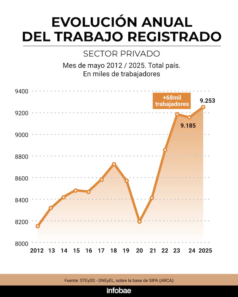 En 2025 se registró el mayor número de trabajadores registrados del sector privado desde 2012: fueron 93 mil las personas que se incorporaron a ese segmento del mercado laboral entre mayo de 2024 y mayo pasado.