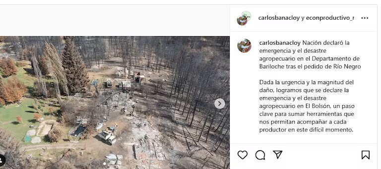 Durante un encuentro convocado por la Secretaría de Agricultura, Ganadería y Pesca de la Nación, ante la Comisión Nacional, el ministro de Desarrollo Económico y Productivo de Río Negro, Carlos Banacloy, presentó un informe técnico en el que detallaba el impacto en la región. “El fuego arrasó 3.825 hectáreas, afectando a más de 150 productores ganaderos, forestales y frutícolas”, señalaba el funcionario a través de sus redes.
