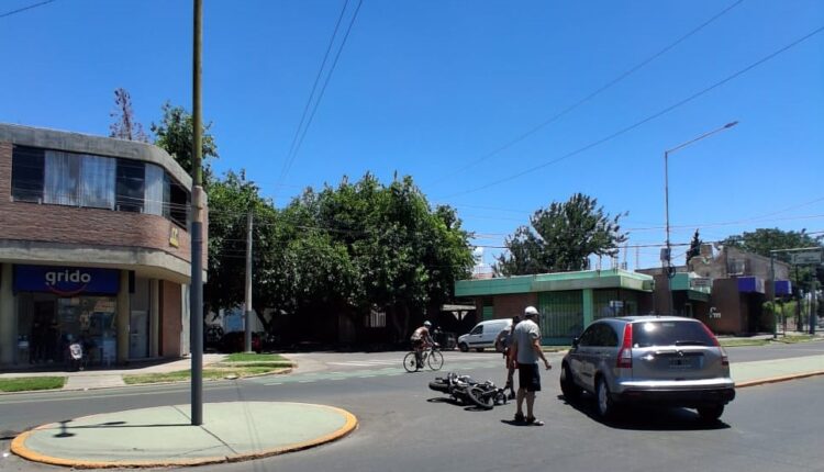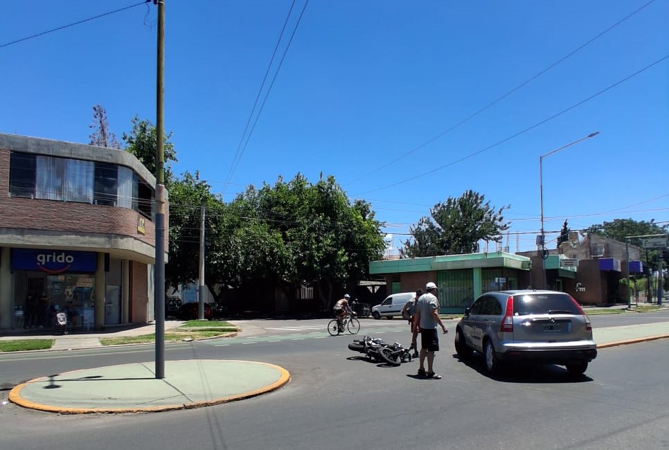 El siniestro ocurrió en la intersección de calles 25 de Mayo y Marcial Quiroga. El conductor de la moto sufrió una fractura y fue trasladado al Hospital Rawson.