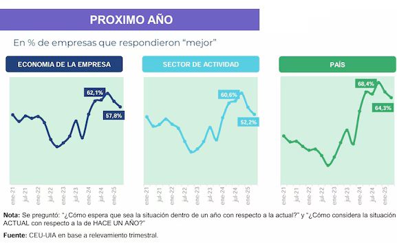 En cuanto a las perspectivas, la encuesta revela un aumento en la proporción de empresas que perciben su situación económica actual como peor que la del año pasado, tanto a nivel empresarial como sectorial y nacional. De igual modo, se observa una moderación en el optimismo hacia el futuro: el 57,8% de las compañías prevé mejoras en su situación económica empresarial, frente al 62,0% del relevamiento anterior; el 52,2% espera una mejoría en su sector, contra el 57,5% previo; y el 64,3% anticipa avances a nivel país, frente al 68,6% previo.