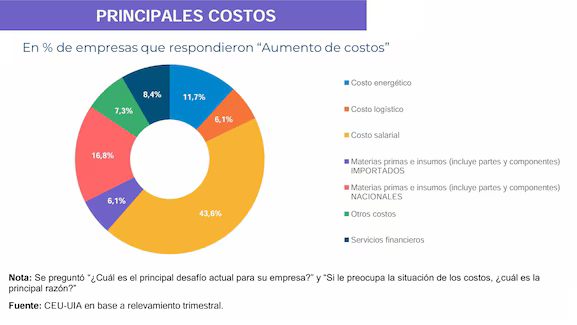 Las empresas enfrentan diversos desafíos derivados del contexto actual. Para el 30,4% la principal preocupación es el aumento de costos. De acuerdo al detalle publicado por la UIA, el mayor “temor” tiene que ver con la evolución de los salarios (43,6% lo señaló como la principal preocupación). También pesa el costo de las materias primas e insumos nacionales (16,8%) y el costo energético (11,7%), entre otros puntos.
