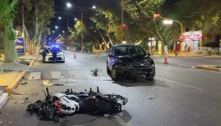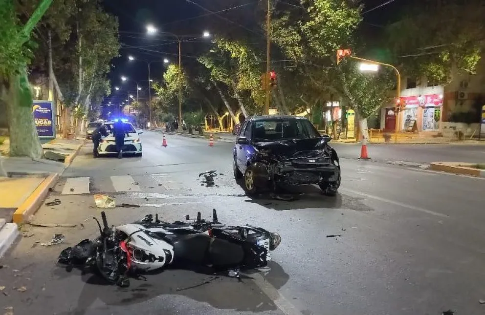 El siniestro ocurrió a metros de la plaza departamental. El motociclista y una mujer que iba en el auto fueron trasladados al Hospital Rawson.